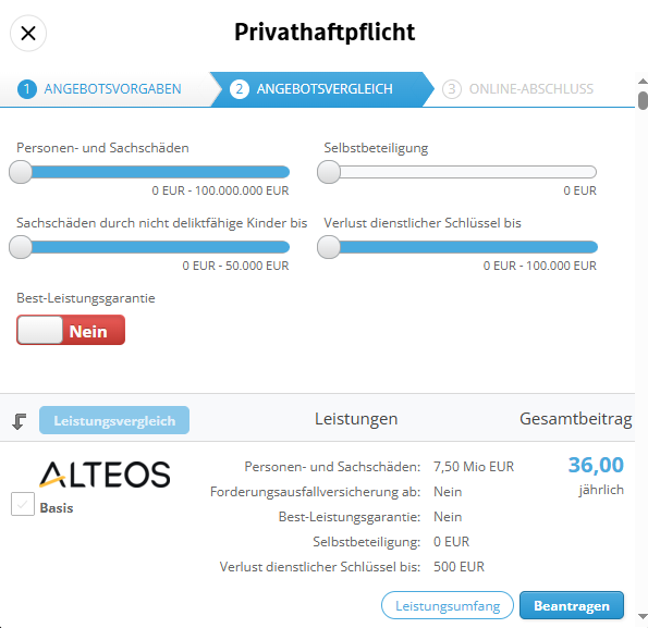 Trage einfach die gefragten Informationen ein, filtere und vergleiche den Deckungsumfang. Anschließend kannst Du die gewählte Police ganz einfach selbst online beantragen.